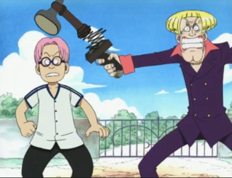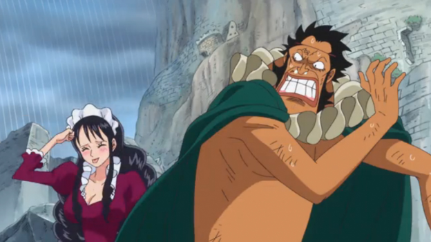 After Sanji bounces from his fight with Kalifa in Enies Lobby, we’re all treated to some girl on girl action when Nami takes his place. We don’t get to see Kalifa lathering Sanji’s body and making him moan and whine, just Nami, because that’s what Oda’s target audience likes—according to Oda. When the rest of CP9 get their devil fruit upgrades, we get the bizarre hilarity that Oda is known for, and what makes One Piece fights so unique and memorable: a giant giraffe and a wolf chasing a chained Zoro and Usopp combo, all the while a deranged reindeer stomps around wailing dumbly in the background, ready to kill them all. Kalifa’s upgrade was unique because it was the only non-zoan type, and it was the only one that could be used for some sense of visual titillation. Nami regularly gets paired with the female fighters, and it’s not the first time she battled against a visually appealing foe: Miss Doublefinger obviously shares a tailor with Sadi-Chan. I just think it’s interesting that the only female villain of the arc has a fight premised on fanservice, when we all know the hottest member of the team is Rob Lucci and we all would have felt better seeing more of him, but I digress.