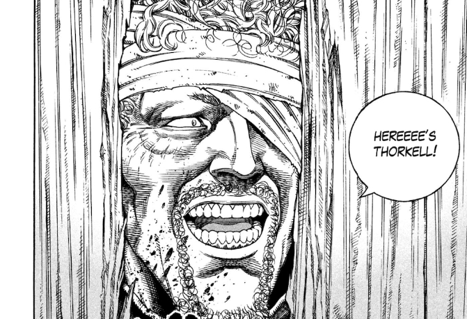 In the same chapter, a secret weapon that hadn’t even been referenced before suddenly appears: a beast man called Ymir, summoned to defeat Thorkell. Considering Floki had been wandering around scared shitless in the preceding chapters, to see his expression abruptly switch to gloating confidence as he brings forth Ymir from a random wooden compartment in his cabin is strange to say the least. Ymir is also a non-human entity. As far as I remember, Vinland Saga was a historical manga, not a dark fantasy.